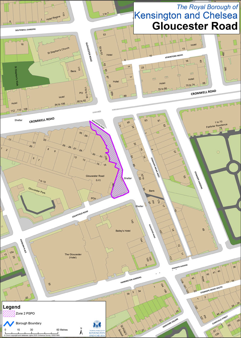 • Map 2 and 2A – Around Harrods, to include all the shop frontages up to 63 Brompton Road and extended along half of Basil Street from Hans Crescent.