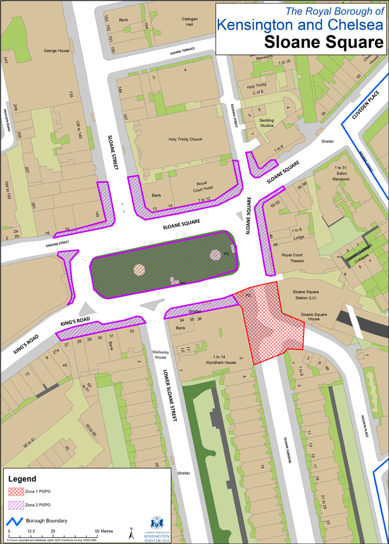 The proposed variations to the red zone (Zone 1) PSPO include one new zone outside Sloane Square Underground Station – Map 1 .